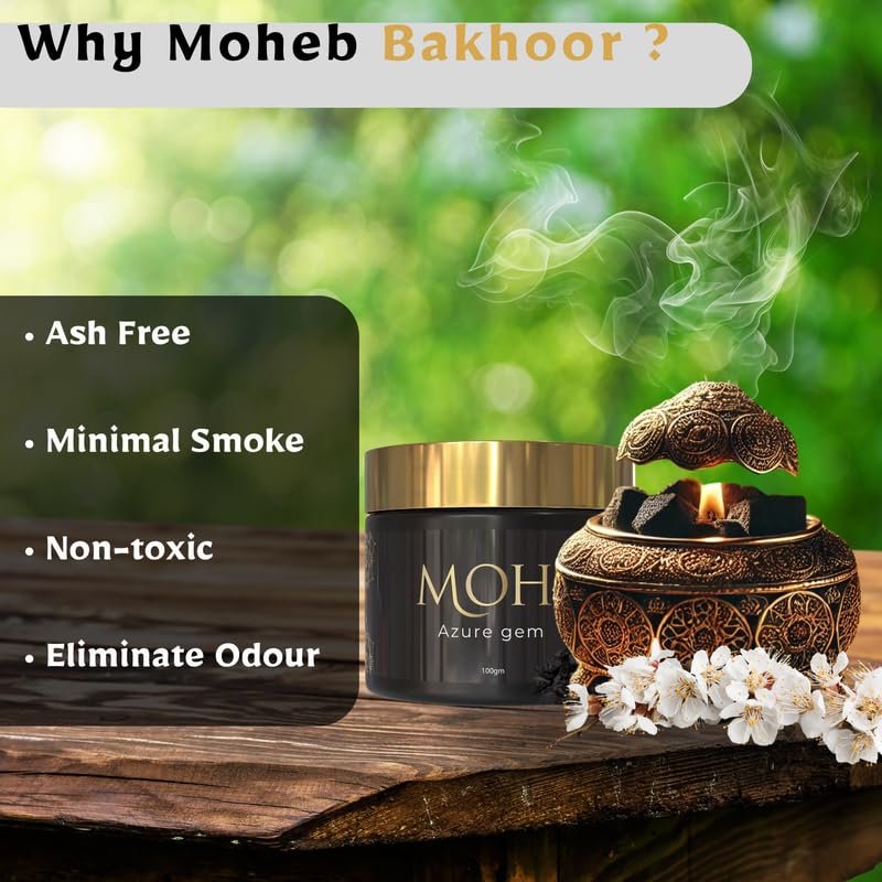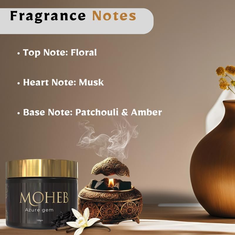 Transform your space with the regal aroma of Moheb Azure Gem Oud Muattar. Crafted for those who appreciate the finer things in life, Moheb Azure Gem Oud Muattar is a masterpiece of aromatic luxury. These premium oud chips (muattar) are meticulously infused with a unique blend of rich, warm fragrances, featuring deep woody base notes balanced by subtle hints of sweet rose and amber.
